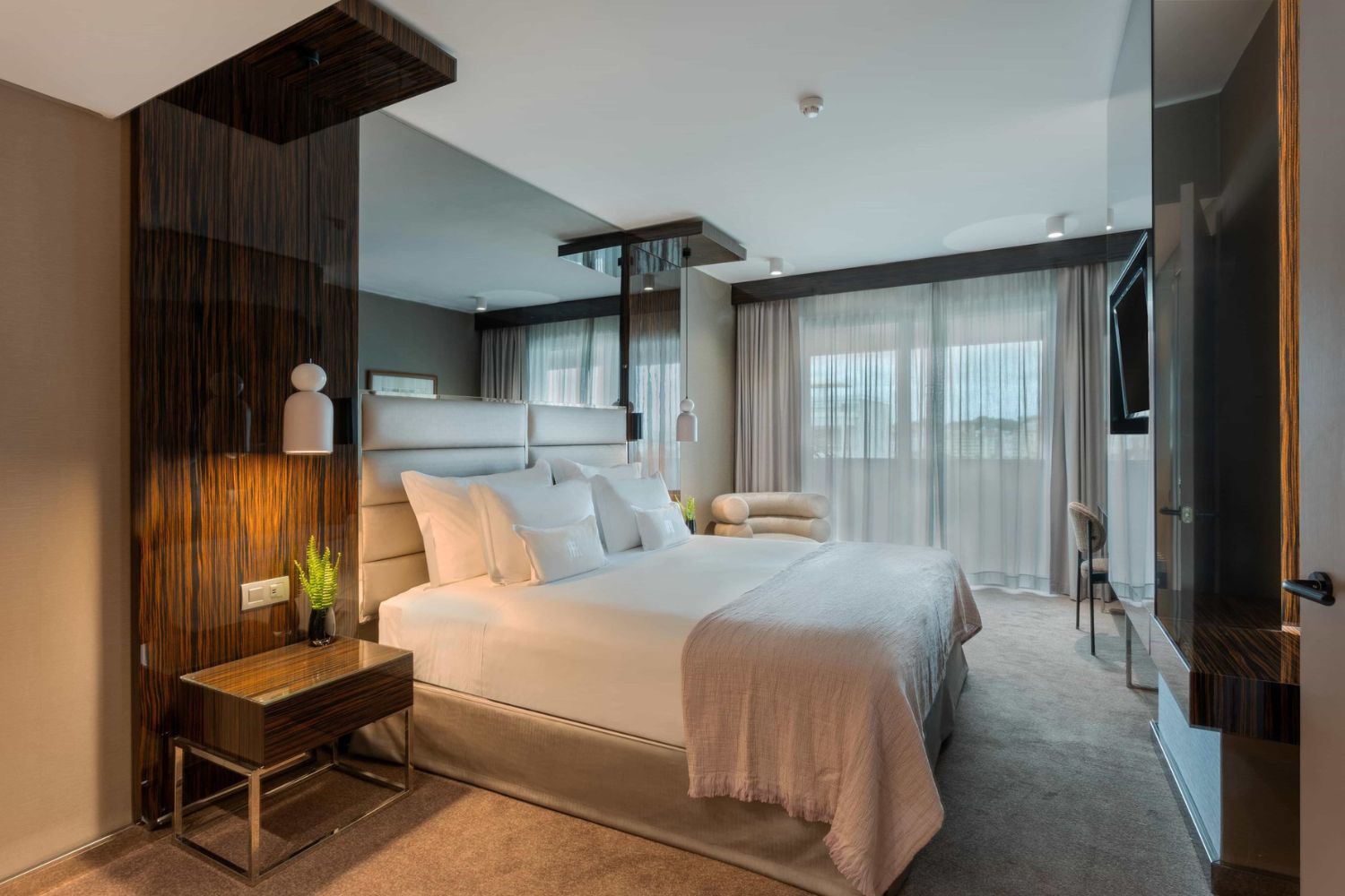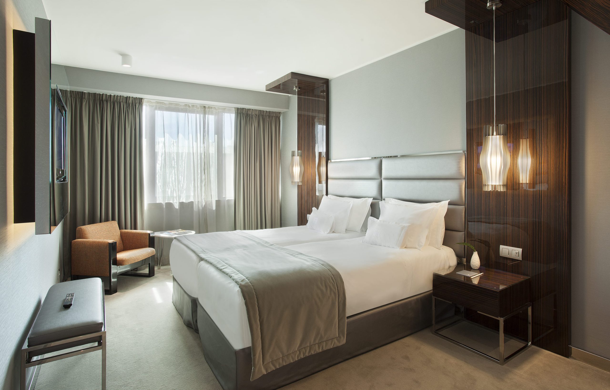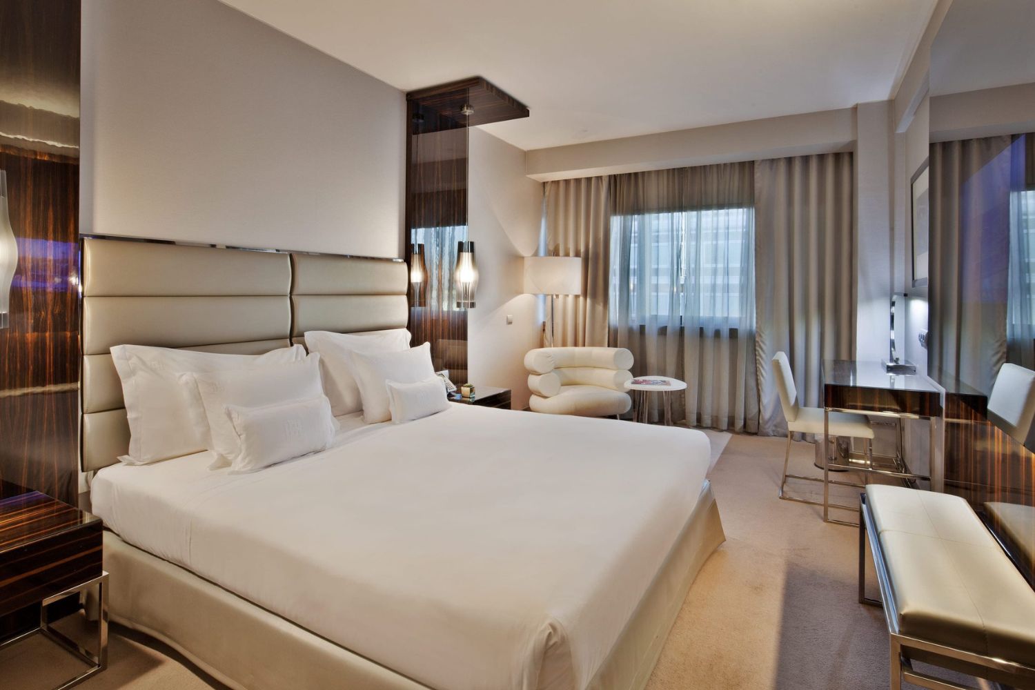 Decorated in an elegant and sophisticated style, our Premier Deluxe rooms afford a magnificent view over the city of Lisbon. They stand out for their exclusive associated services, first day vip, you can also enjoy an evening cocktail and canapé in the panoramic S. Jorge Bar, from 7 pm to 9 pm, when you show your golden keycard (21–25 sq.m)