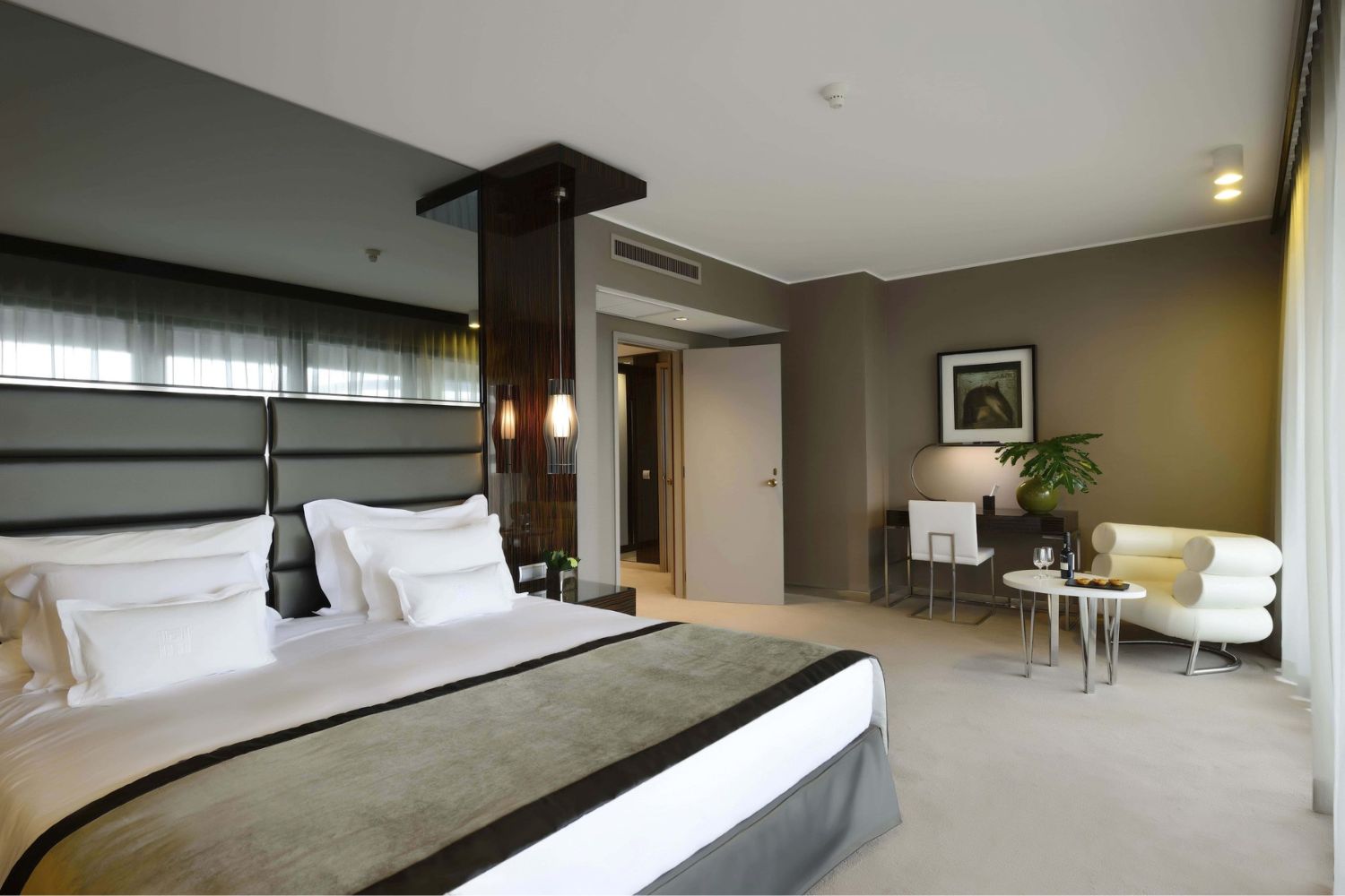 With their elegant, signature ebony and stainless steel furnishings, the Deluxe rooms are both comfortable and sophisticated. They have a work area with a desk, lighting and stunning views over the city of Lisbon and the courtyard of the Altis Grand Hotel (23-33 sq.m).
