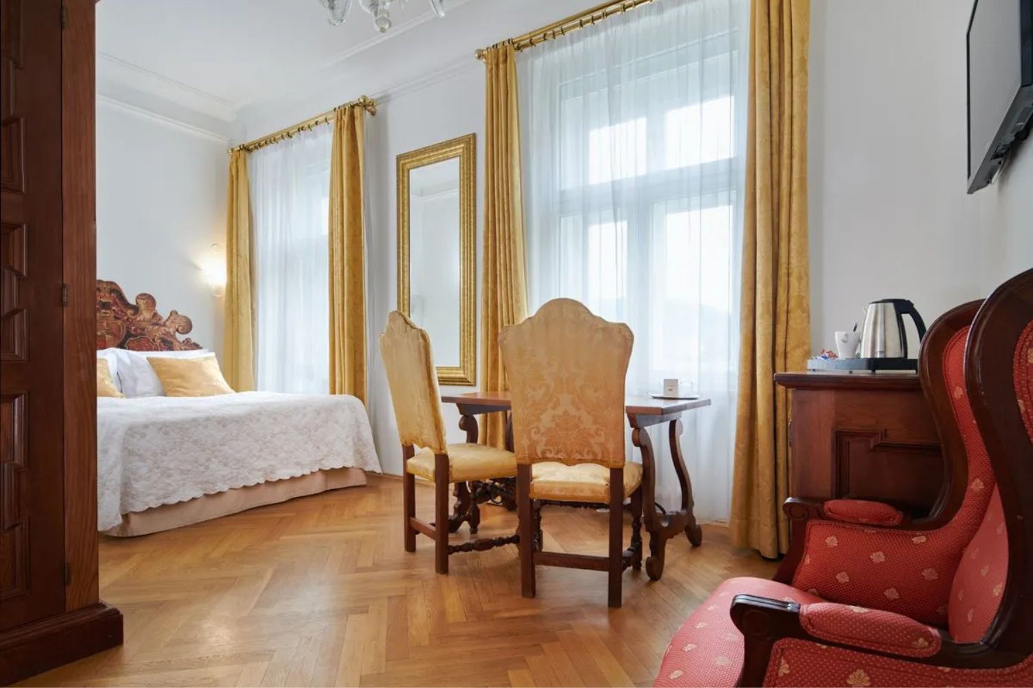 The Double-Budget Room with a view to the interior corridor of the building boasts a spacious area, providing an ideal environment and space to enjoy a splendid stay in Prague. Despite the truly unusual view, the room is equipped with all the essential comforts for a pleasant stay. Guests can avail themselves of all the services available in other room types even if they will have an indoor corridor view. We recommend this room type for short-term stays and for those who want to enjoy a comfortable yet economical stay, close to most of the main attractions that the center of Prague offers.