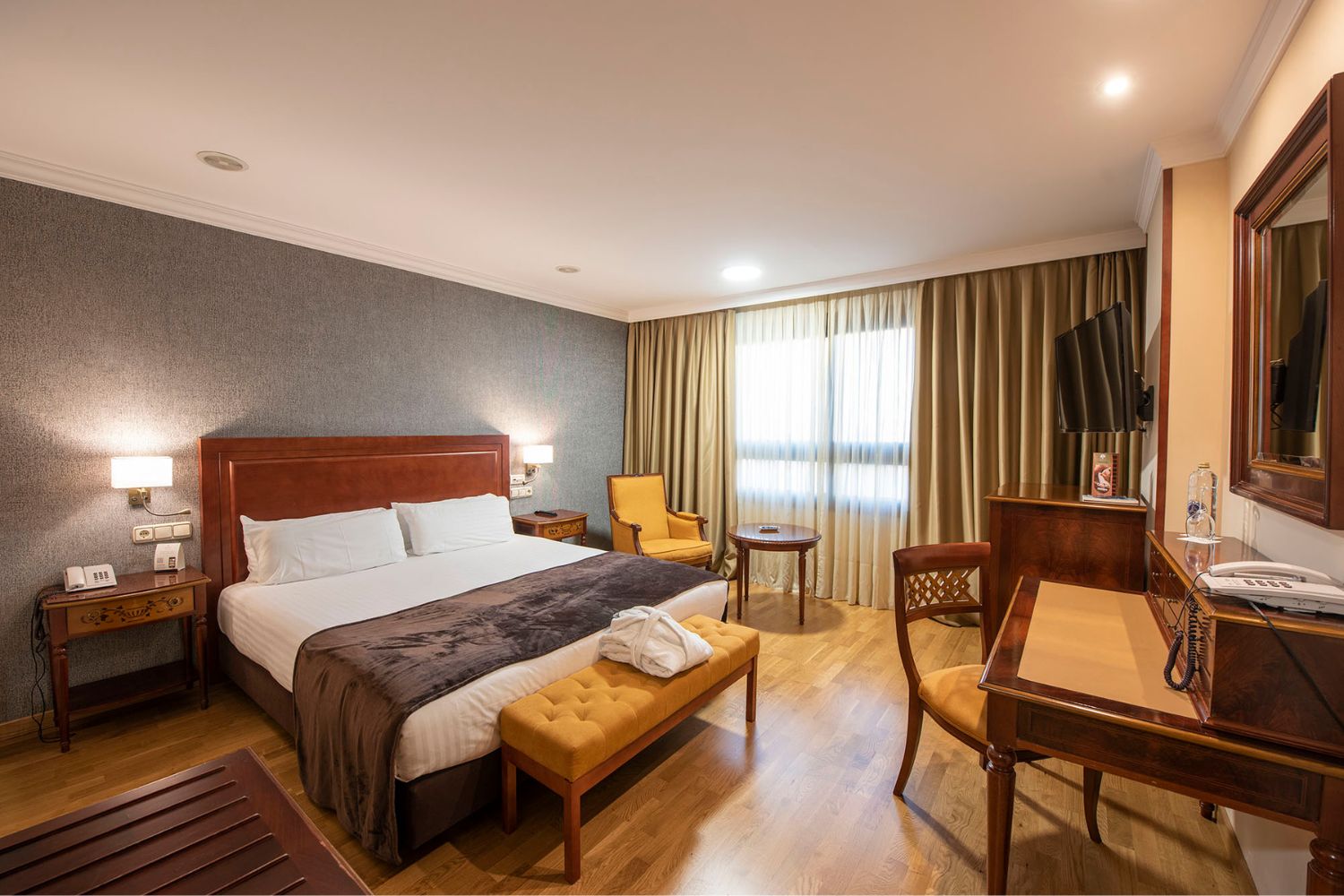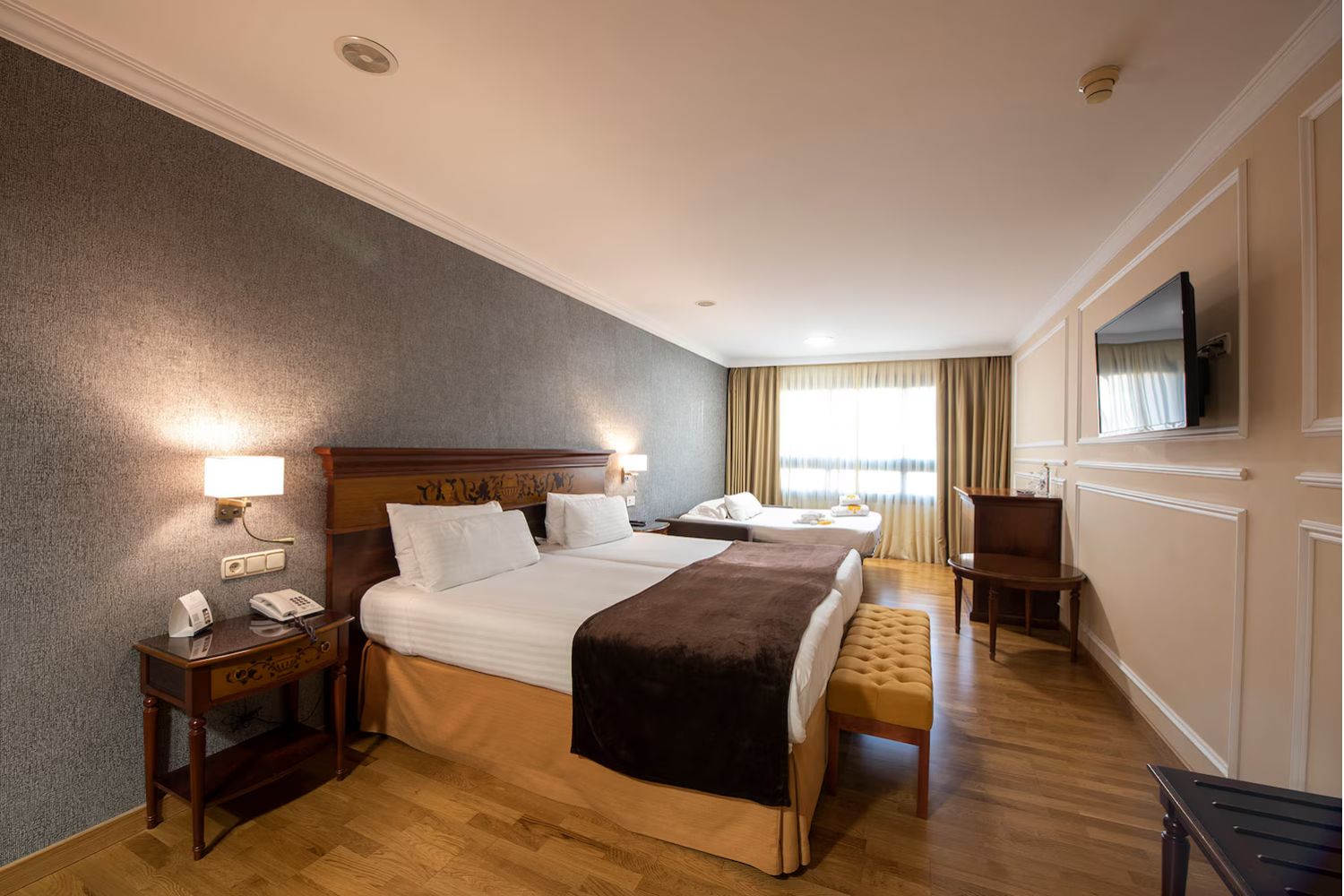 These rooms can accommodate up to three adults, with a double bed and a comfortable extra bed. Recently renovated and with all kind of services, the rooms of Eurostars Araguaney are bright and offer views to the city centre of Santiago de Compostela.
