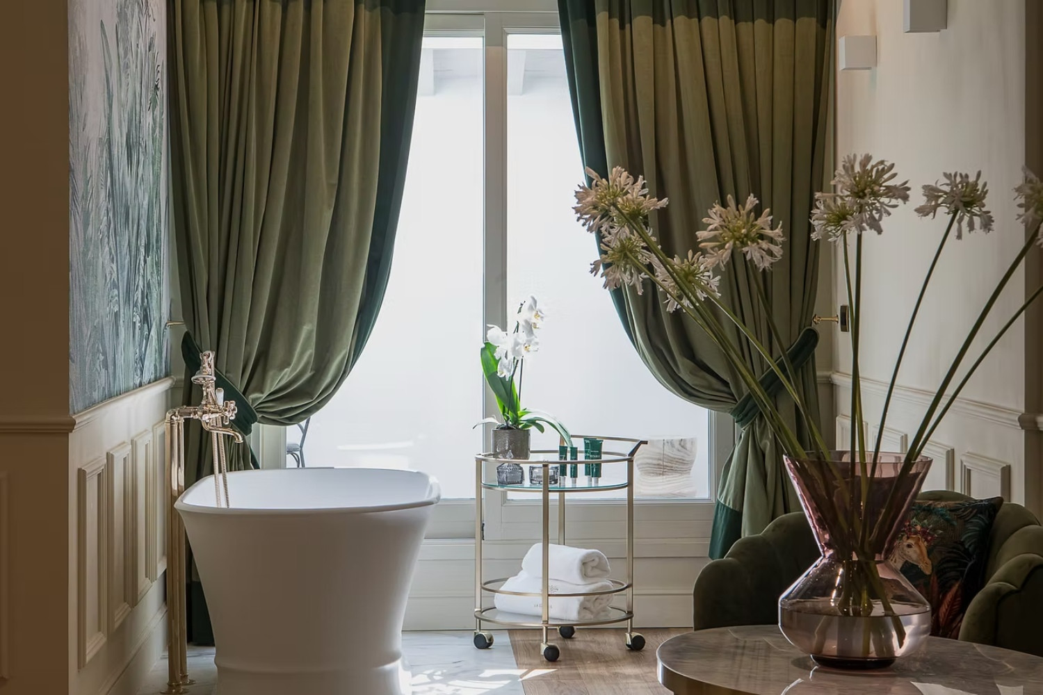The junior suite invites you into a world of refined indulgence, boasting a serene bedroom and marble bathroom with shower and bidet. Enhancing your stay, the suite offers a seamless blend of tranquility and convenience, complete with soundproof walls, a minibar, an iPad, a safe deposit box, and a TV for your utmost comfort.