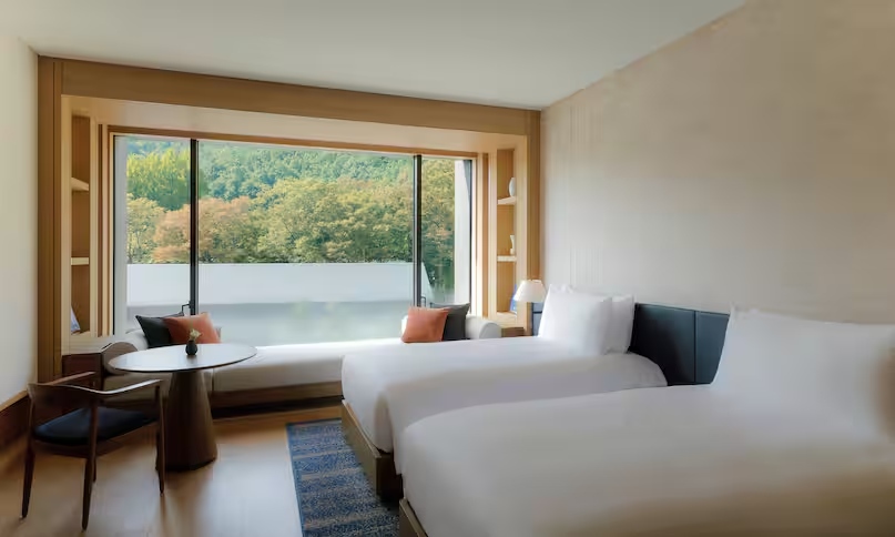 Deluxe rooms feature a modest yet elegant design in harmony with nature, overlooking the changing seasonal landscape of Takagamine. The decor incorporates traditional decorative paper Kyo-karakami, as well as other crafts of Kyoto. Capacity for 3 people (with supplement).